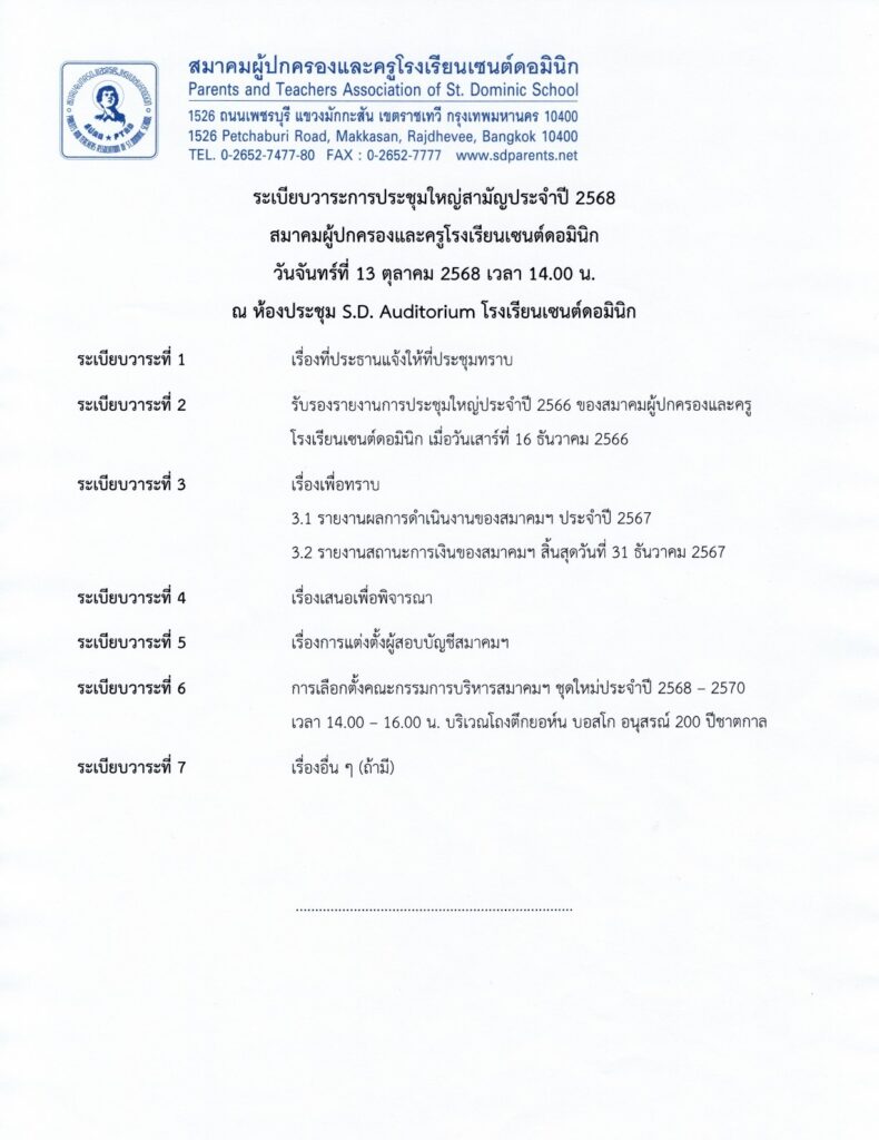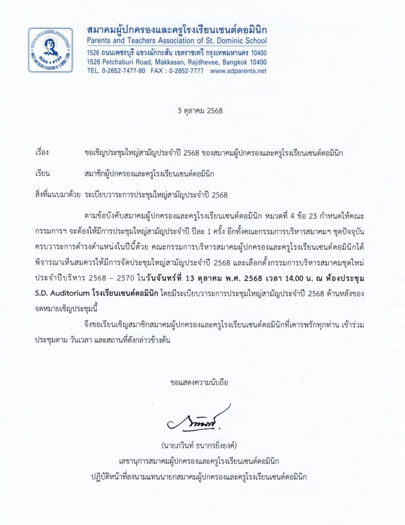 เอกสารเชิญประชุมใหญ่สามัญประจำปี 2568 ของสมาคมผู้ปกครองและครูโรงเรียนเซนต์ดอมินิก (จ.13 ต.ค. 68)