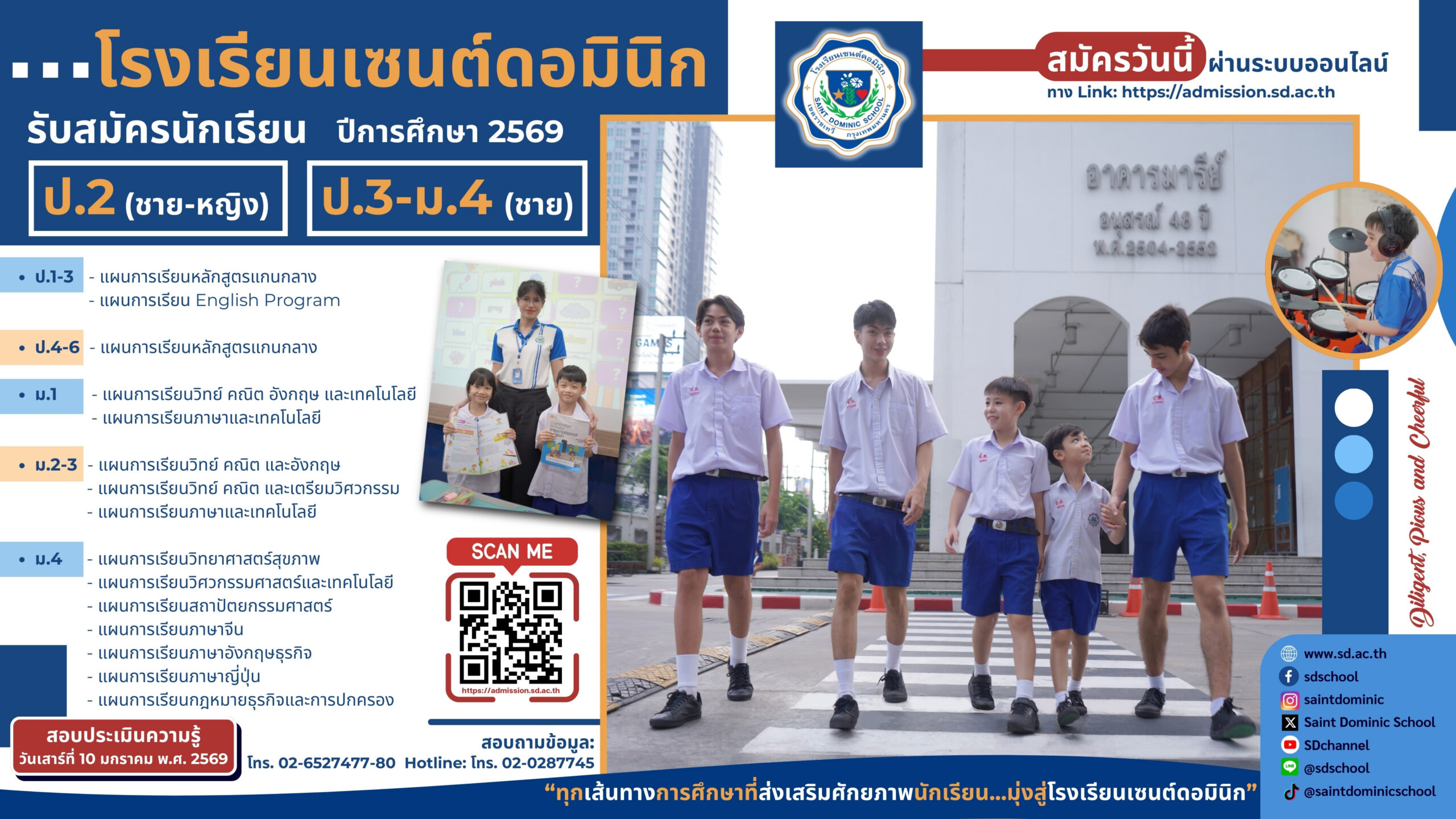 โรงเรียนเซนต์ดอมินิก รับสมัครนักเรียนชั้น ป.2 (ชาย-หญิง) และ ป.3-ม.4 (ชาย) ปีการศึกษา 2569