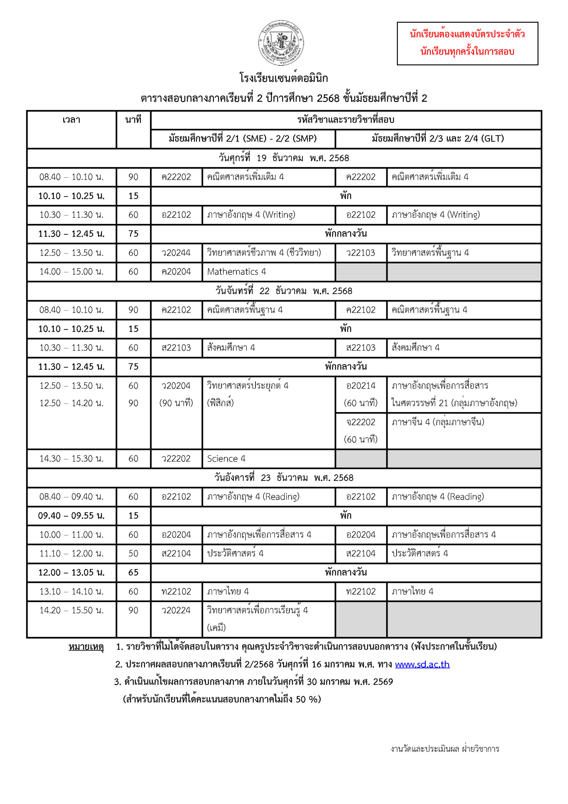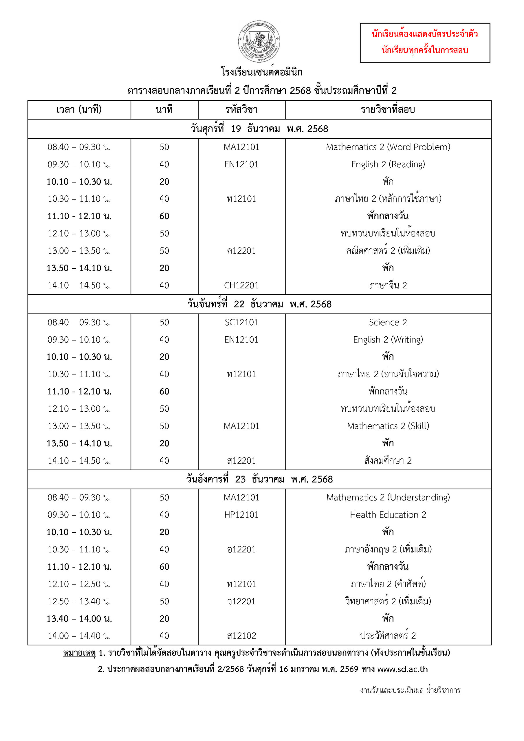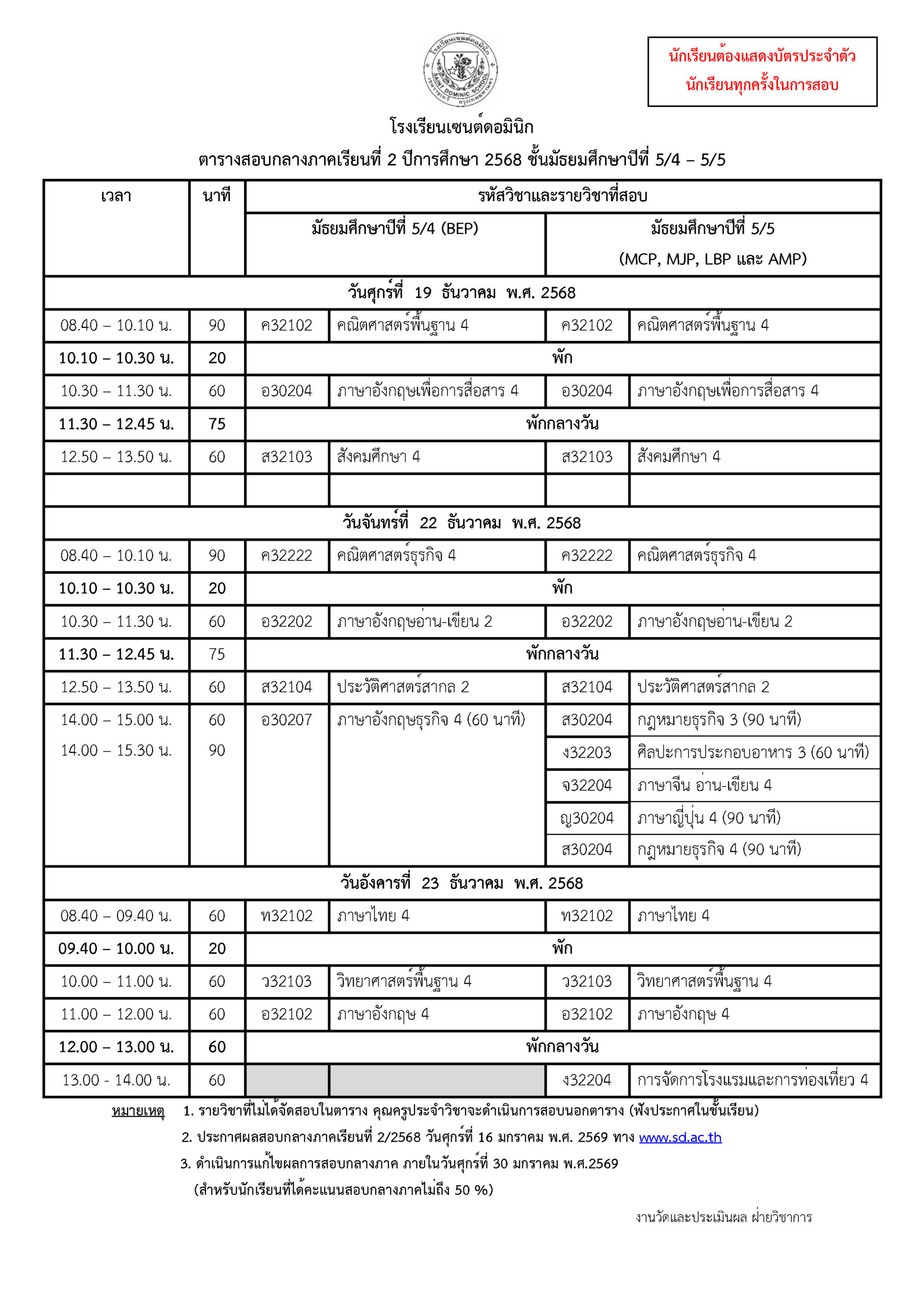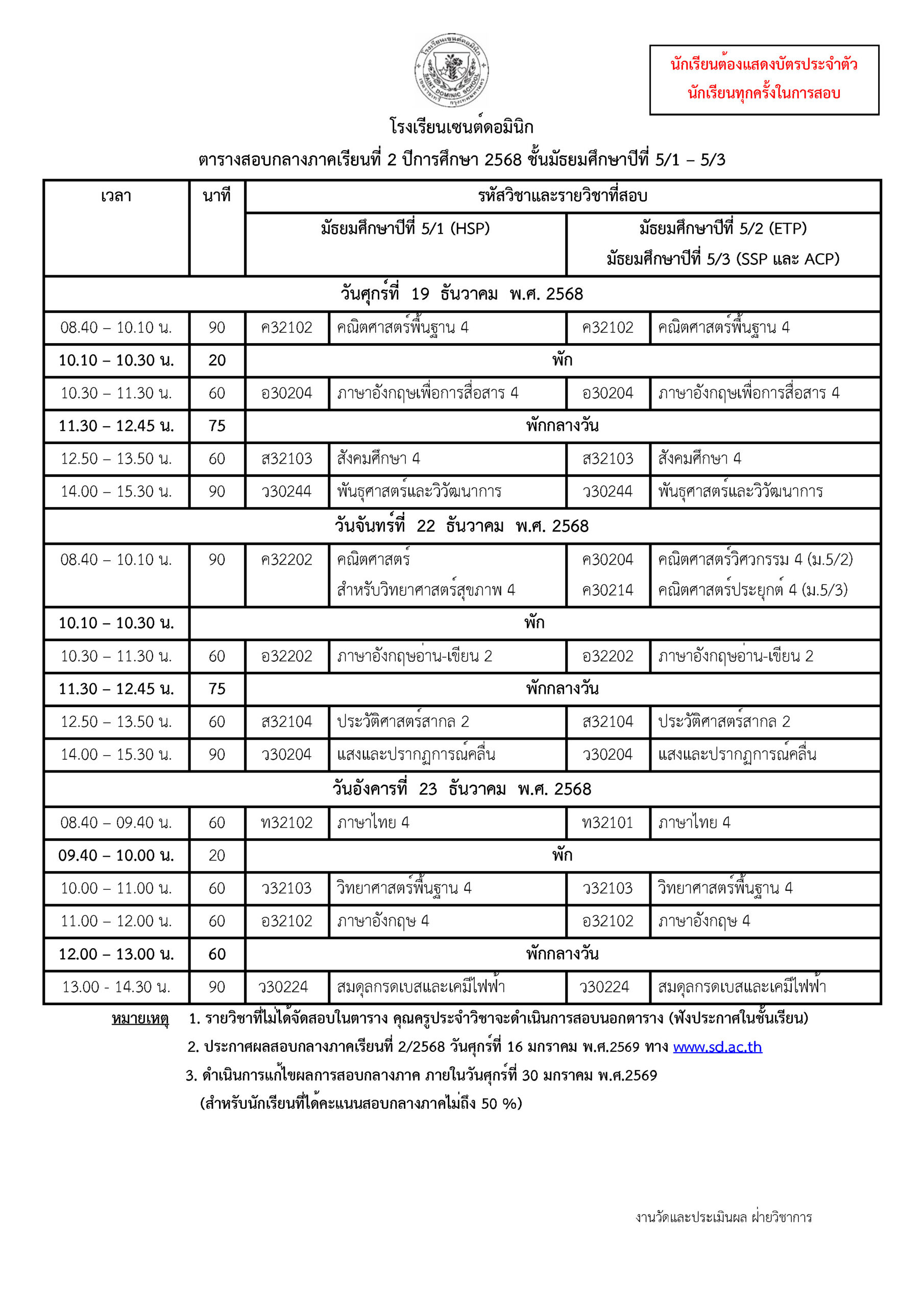 ตารางสอบกลางภาคเรียนที่ 2 ปีการศึกษา 2568 ชั้น ป.1-ม.5