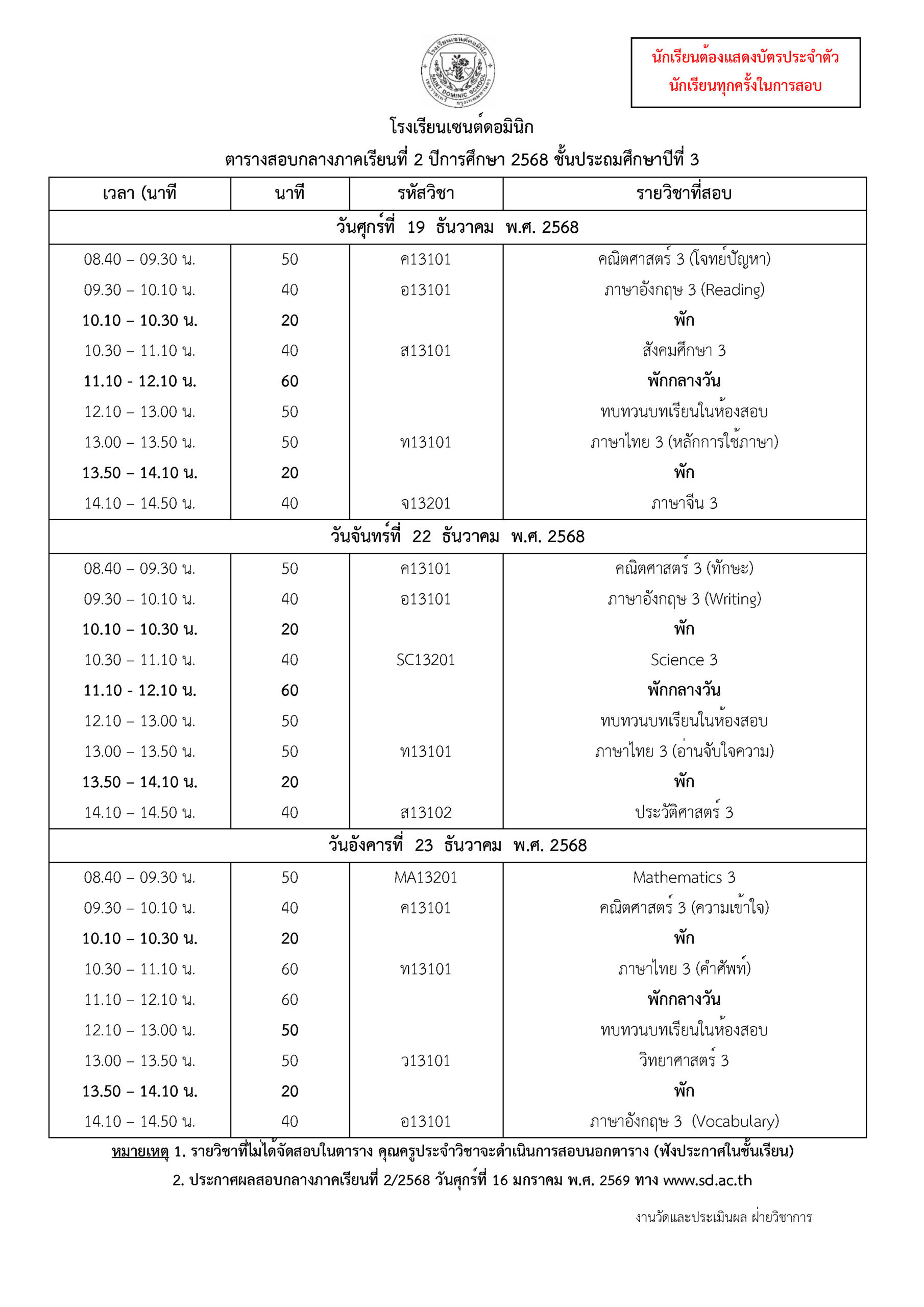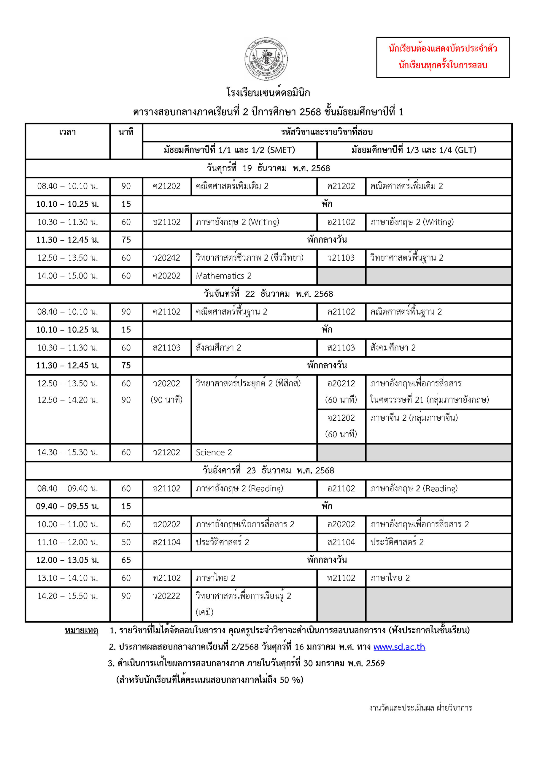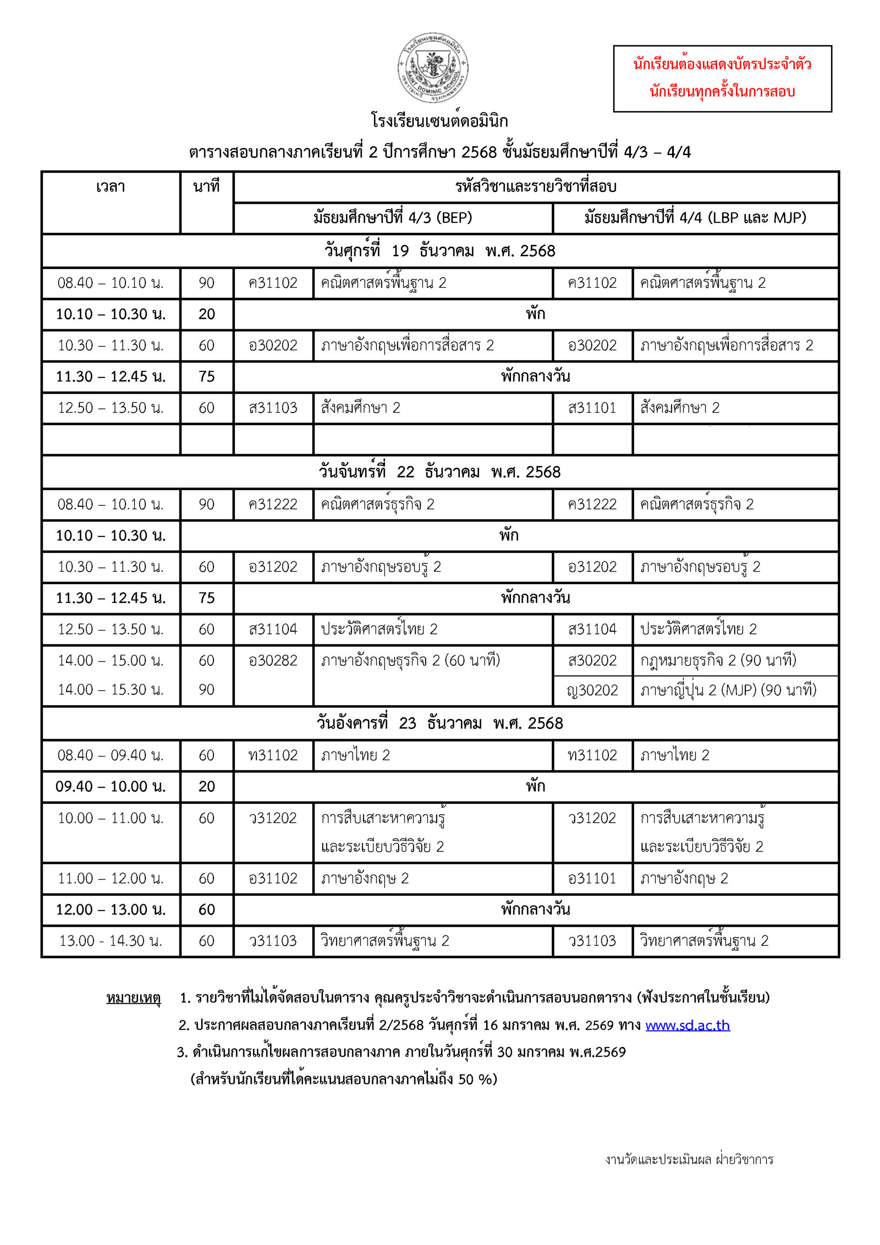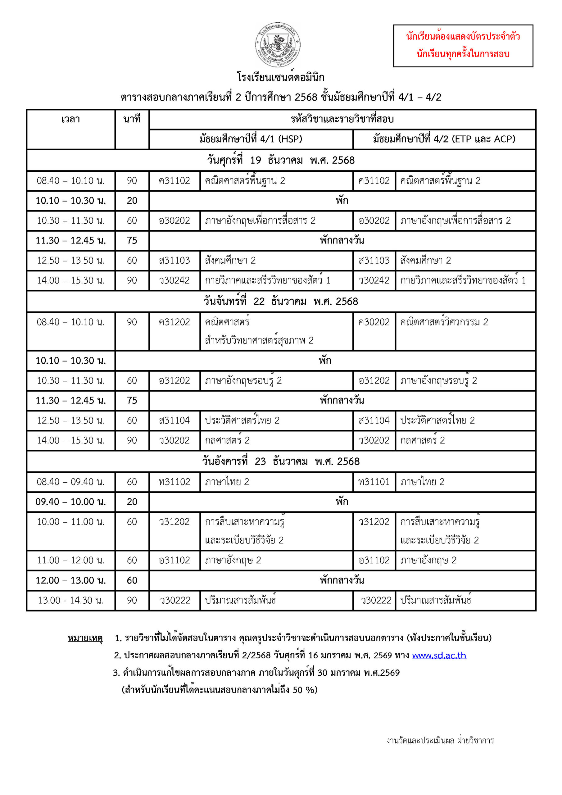 ตารางสอบกลางภาคเรียนที่ 2 ปีการศึกษา 2568 ชั้น ป.1-ม.5