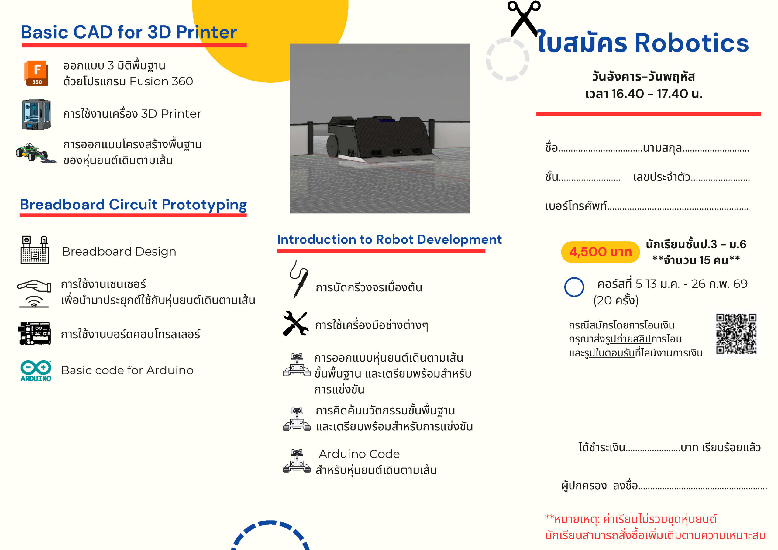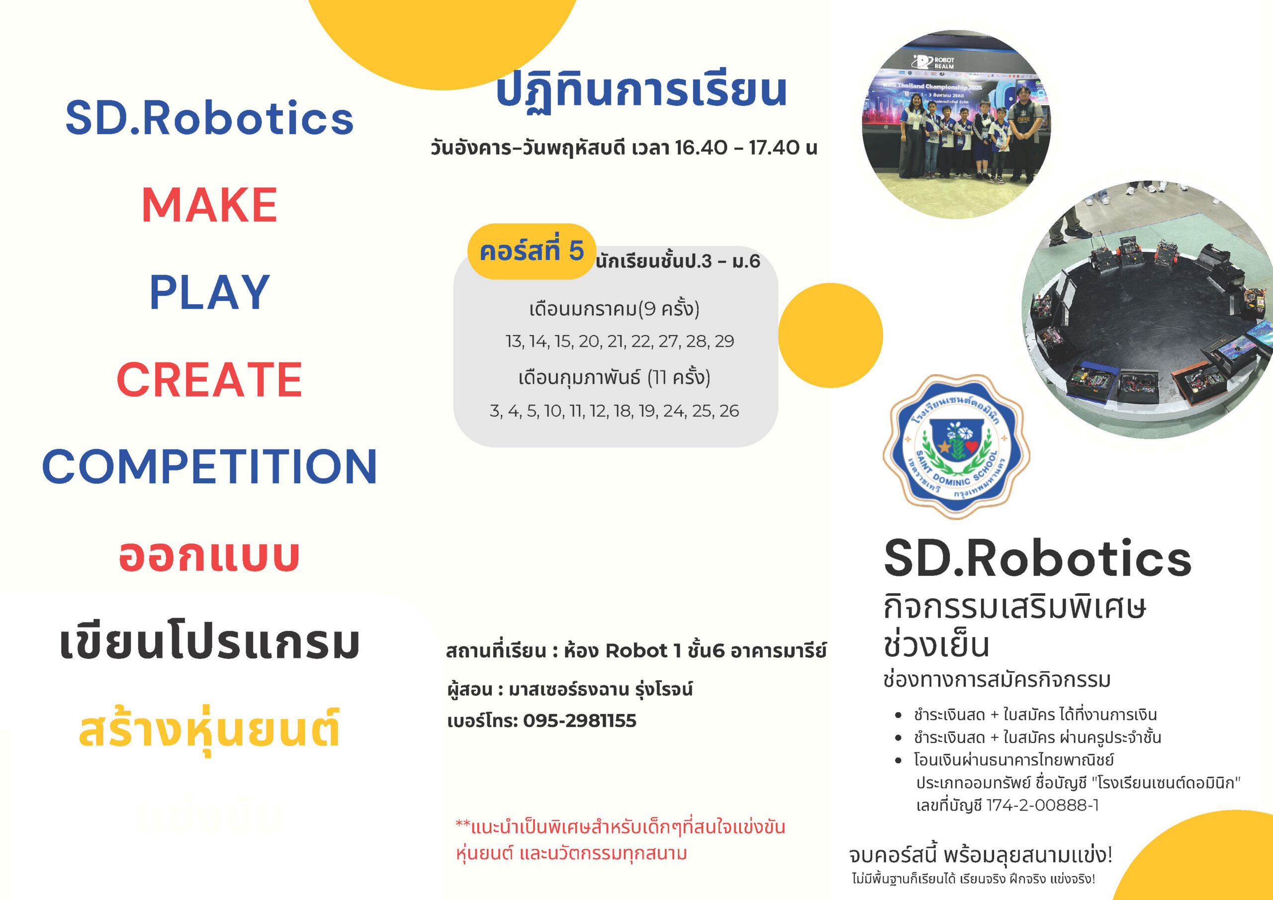 ใบสมัครเรียนกิจกรรมเสริมพิเศษเย็น: S.D. Robotics ป.3-ม.6 (เริ่มเรียน อ.13 ม.ค. 69)