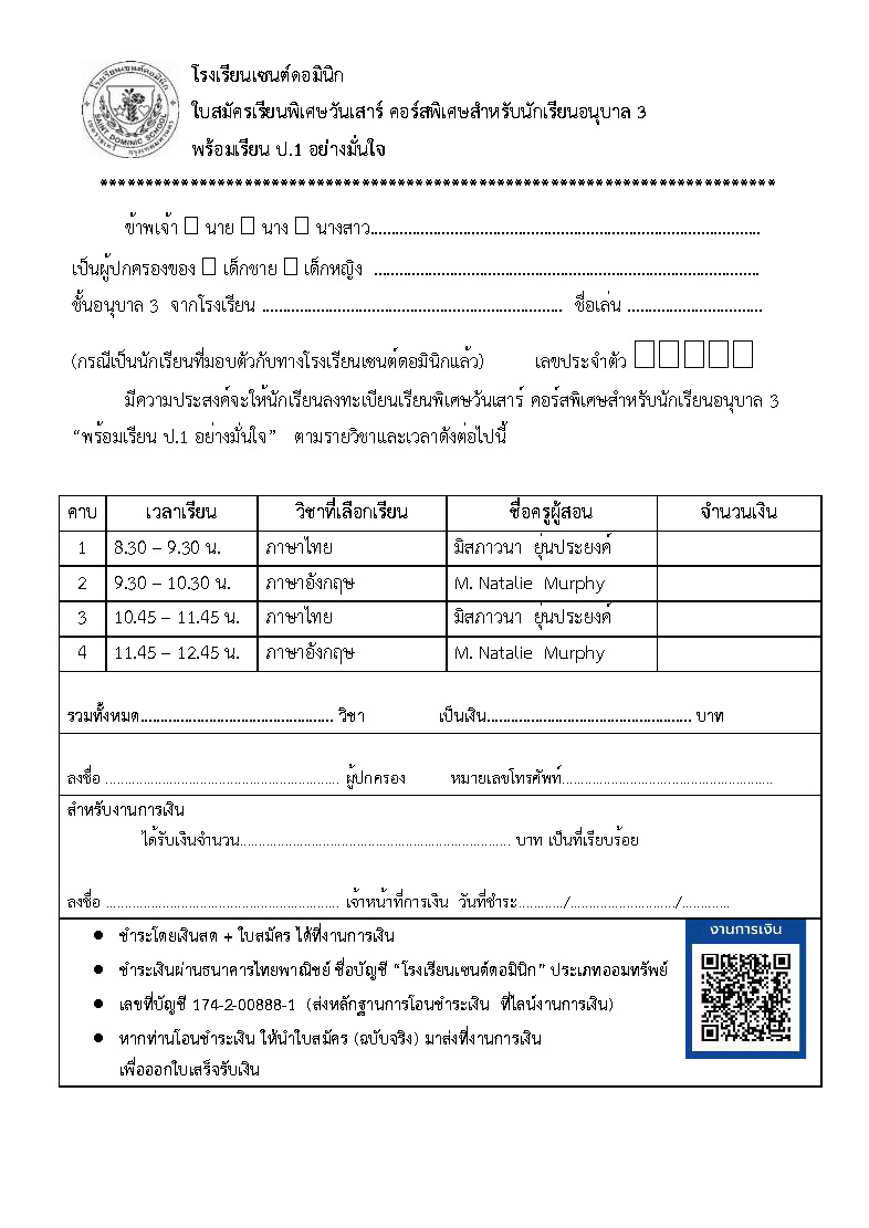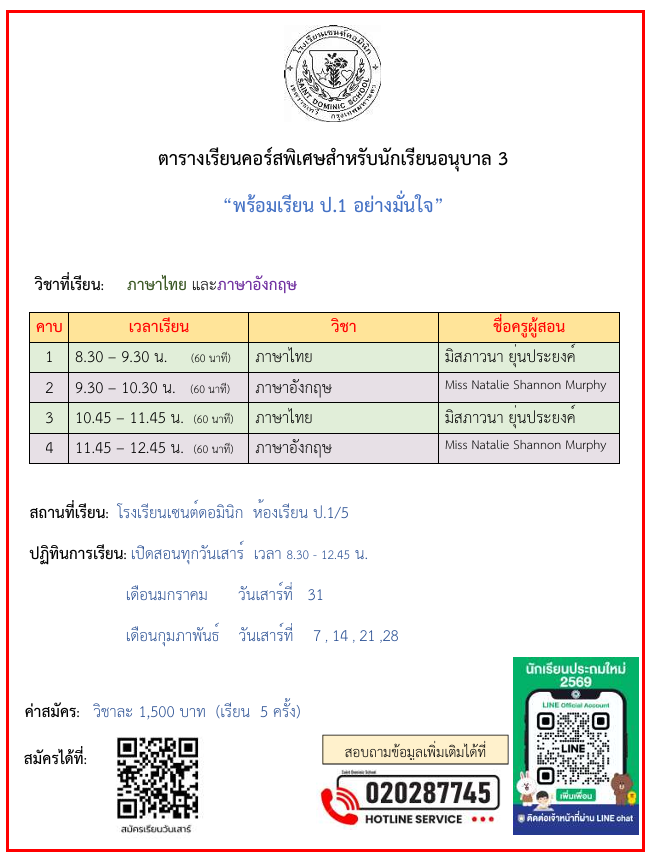 อนุบาล 3 เอกสารสมัครเรียนพิเศษวันเสาร์ ปลายภาคเรียนที่ 2/2568