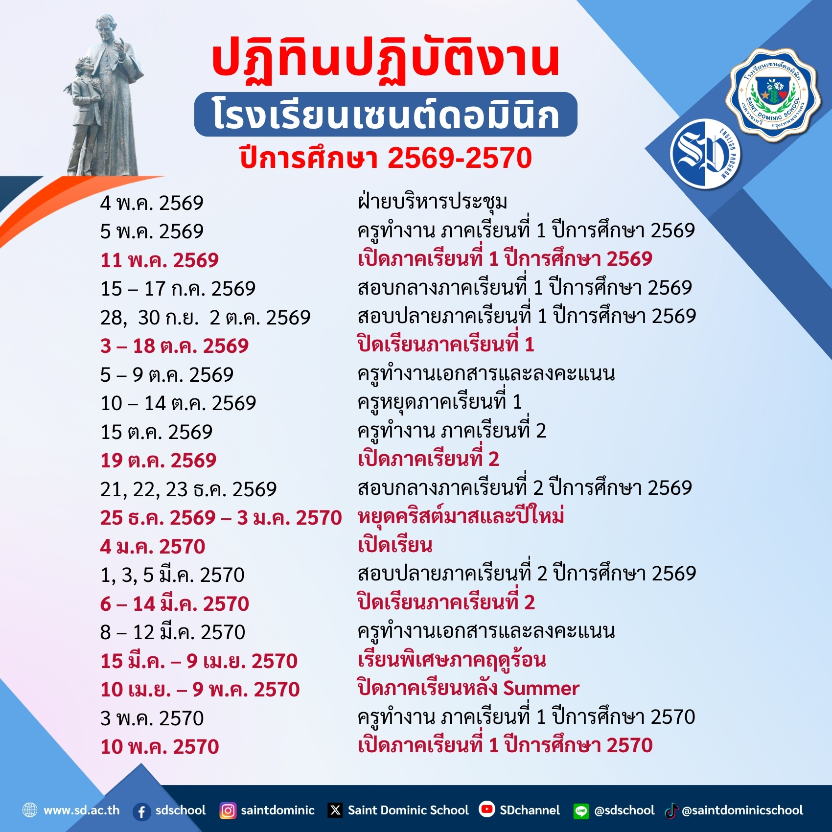ปฏิทินปฏิบัติงานโรงเรียนเซนต์ดอมินิก 2569-2570