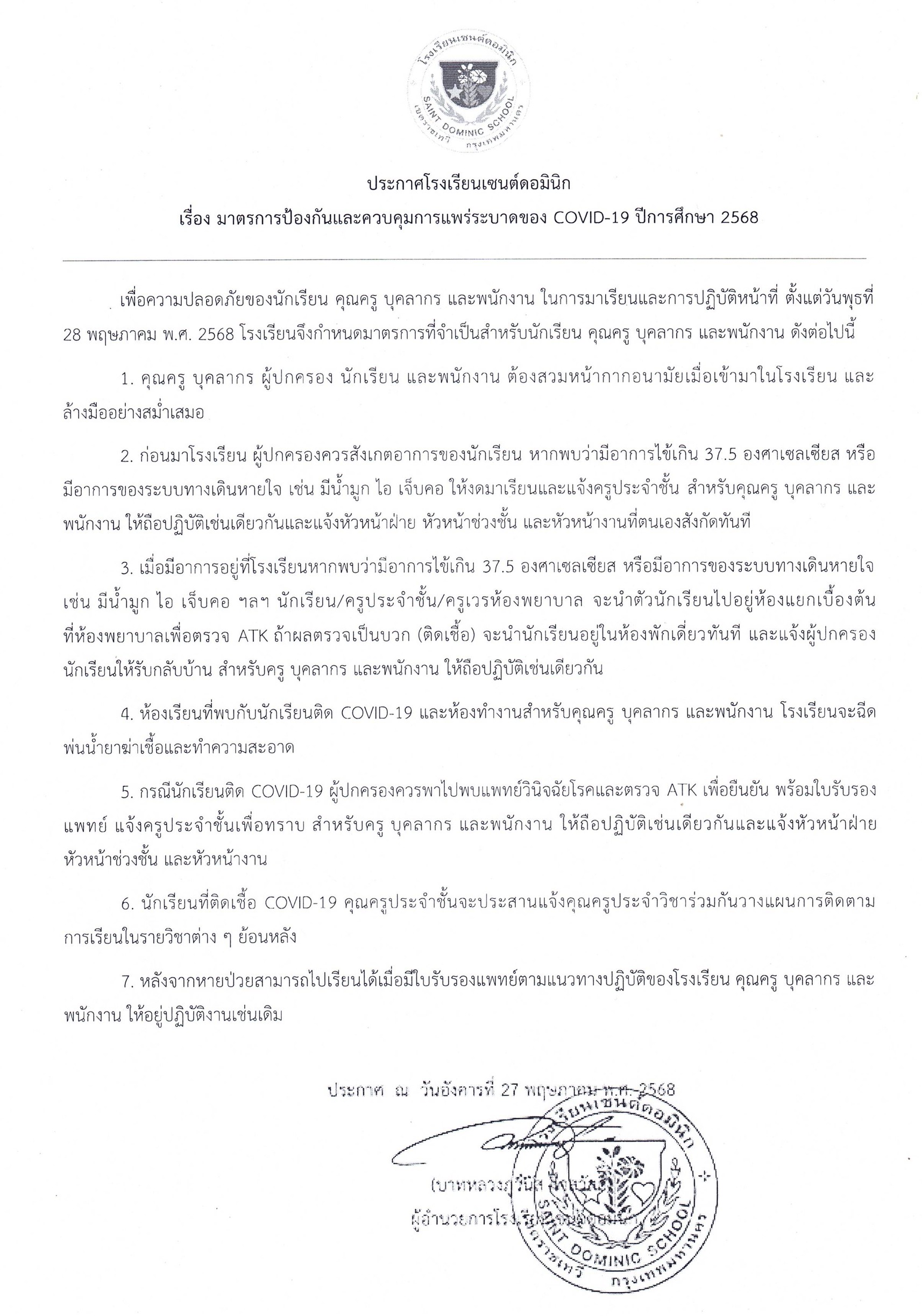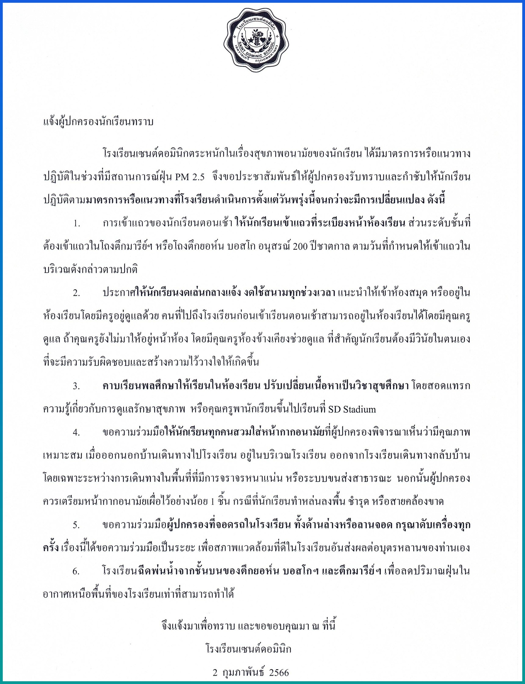แนวทางปฏิบัติของโรงเรียนเซนต์ดอมินิกในช่วงที่มีสถานการณ์ฝุ่น PM 2.5